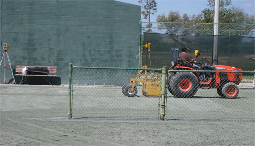 Milling / Scarifying the clay court surface - this step prepares the material to be re-used at the high end of the court, versus throwing away good material which can be moved by the laser-tractor to where it's needed. |