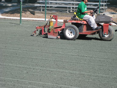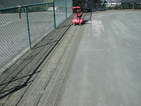 Two views of clay surface during milling / scarifying process. This service needs to be done to help keep the courts algae free, promotes water penetration so courts dry faster after a rain and keeps the courts from being too hard (also getting rid of hard pan). |
